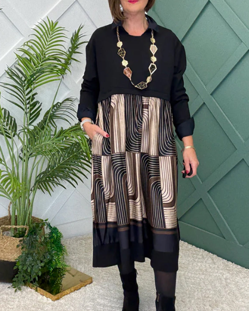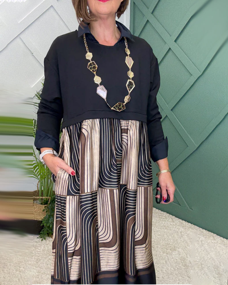 Robe décontractée à revers rayée avec coutures contrastées