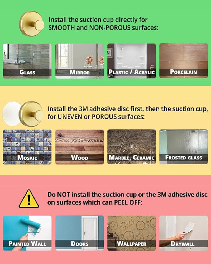 Les crochets à ventouse conviennent aux surfaces planes et non poreuses telles que le verre, les miroirs, le marbre, la céramique, l’acier inoxydable, le bois, l’acrylique, les plastiques et les stratifiés.