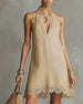 SPÉCIFICATIONS Style: Décontracté Matériel: Mélange de coton,Dentelle Type de la robe: A-Line Longueur de la robe: Longueur du genou Forme du col: Col en V Type du dessin: Couleur pure Type de la manche: Manches régulières Longueur de la manche: Sans manches Détails: Dentelle Type d'ajustement: Habituel Saison: Printemps,Été Occasion: Quotidie...