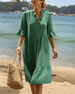 SPÉCIFICATIONS Style: Décontracté Matériel: Mélange de coton Type de la robe: Robe jambe droite Longueur de la robe: Midi Forme du col: Col en V Type du dessin: Couleur pure Type de la manche: Manches régulières Longueur de la manche: Manches 3/4 Détails: Broderie Type d'ajustement: Habituel Saison: Printemps,Été Occasion: Quotidien Contenu du...