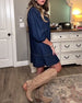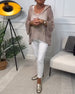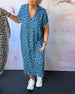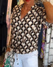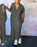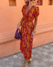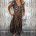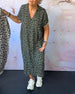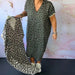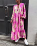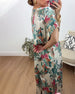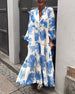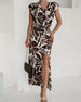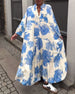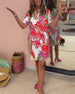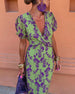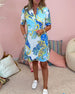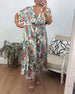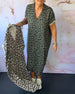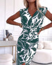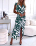 Robe trapèze élégante à manches bouffantes en V profond et imprimé feuilles